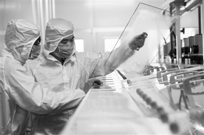 侯琳熙教授(右)在显影液模拟线指导技术人员改进配方。王忆希摄